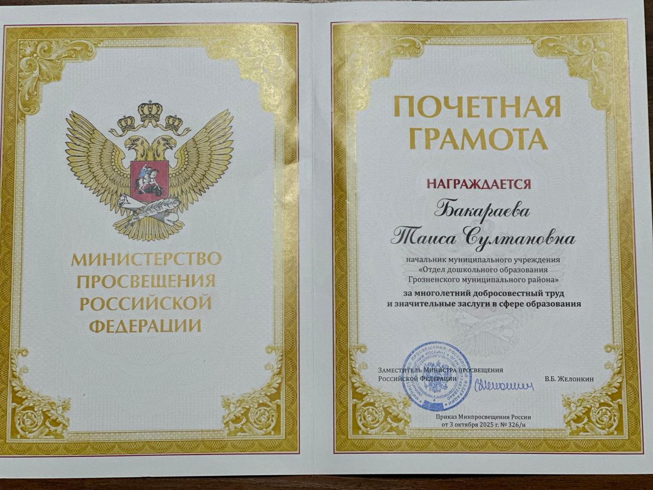 О присвоении Почетной Грамоты Министерство просвещения Российской Федерации за многолетний добросовестный труд и значительные заслуги в сфере образования