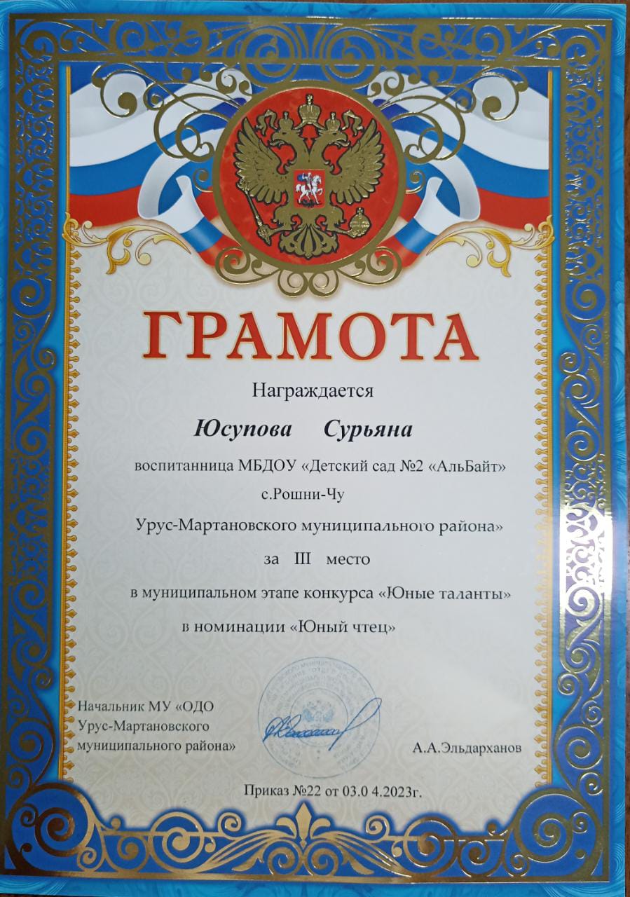 Наша юная воспитанница Юсупова Сурьяна Сулеймановна приняла участие в муниципальном этапе конкурса «Юные таланты» и заняла 3-е почетное место в номинации «Юный чтец». Также наша Сурьяна была приглашена в Дворец культуры им. У. Димаева ...